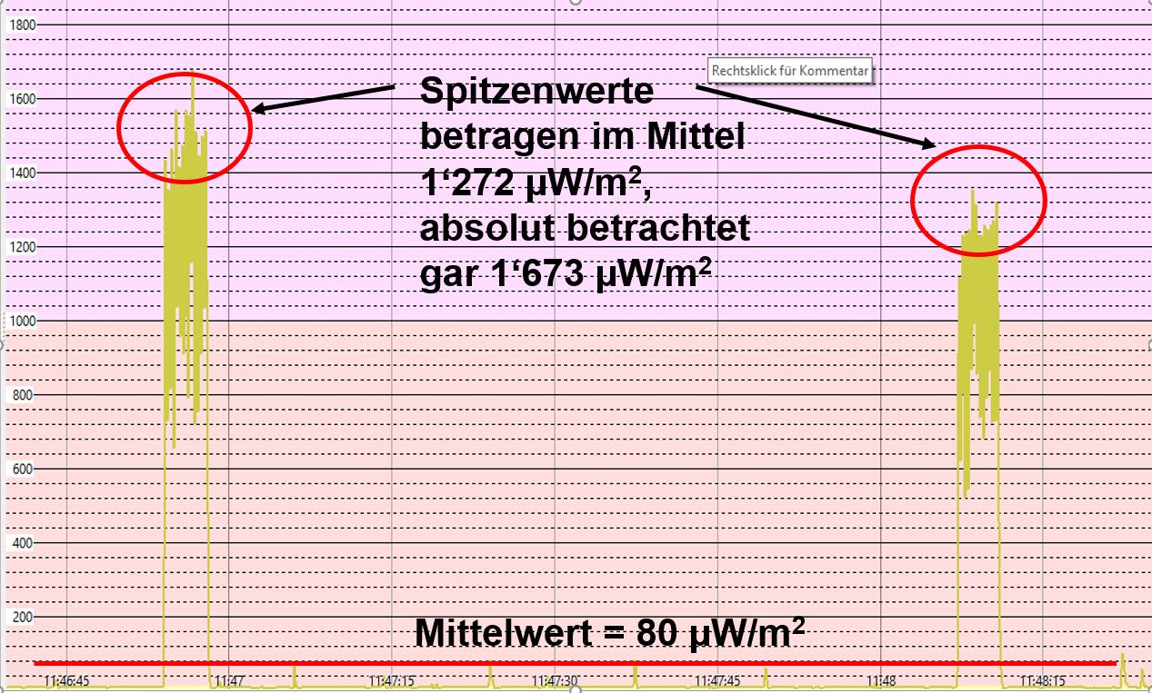 Bei der Einhaltung von Immissionsgrenzwerten für Mobilfunkanlagen und von Anlagegrenzwerten von 5G-Antennen wird der höchste gemessene Mittelwert über 6 Minuten herangezogen. Dies ist umstritten, weil aus biologischer Sicht die Spitzenwerte besonders bedeutsam sind. Diese werden durch die Mittelwertbetrachtung oft „weggemessen“, wie diese Grafik zeigt. Beispiel 1: Es sind die Spitzenwerte von flackerndem Licht, die epileptische Anfälle auslösen können, nicht der Mittelwert, der einem warmen, schummrigen Licht entspricht. Beispiel 2: Ein Laserpointer hat eine Sendeleistung, die nicht über den Milliwatt-Bereich ausgeht. Auf mehrere Minuten verteilt ist der Mittelwert der Belastung minimal, trotzdem führt die Bündelung bereits innert Sekunden zu Sehschädigungen.